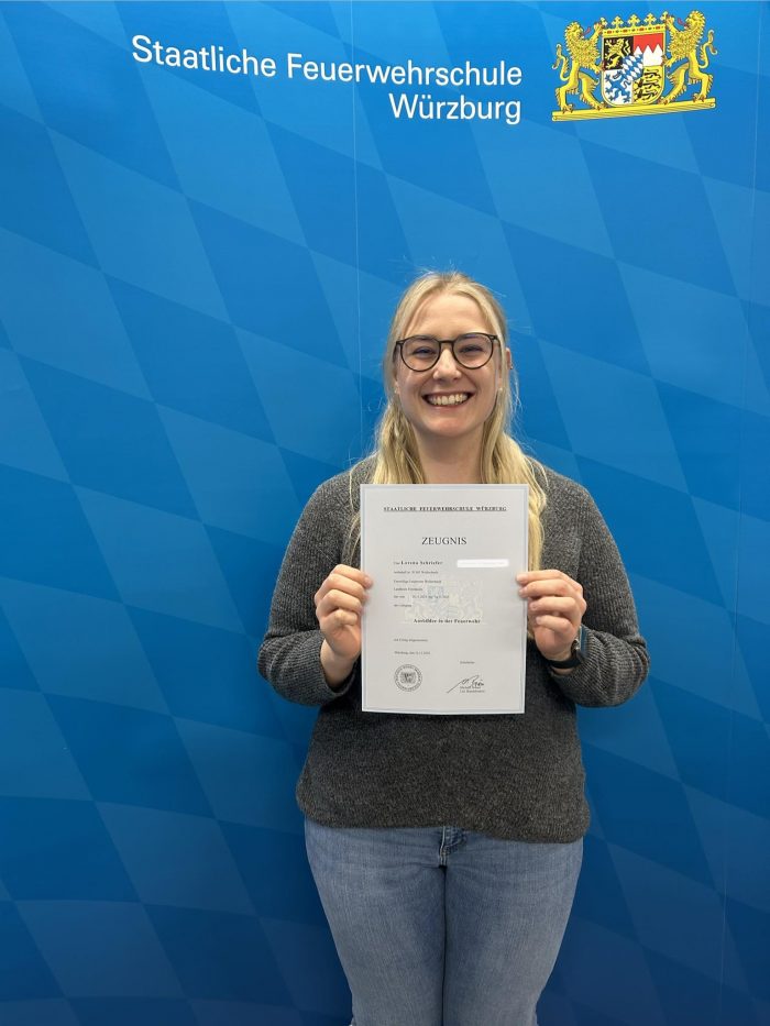In der Woche vom 10.11. bis 14.11.2025 nahm unsere Kameradin Lorena Schriefer am Ausbilder-Lehrgang an der staatlichen Feuerwehrschule in Würzburg teil. Neben verschiedenen Theorie- und Praxismodulen wurde die Prüfung zum Ausbilder erfolgreich abgelegt.