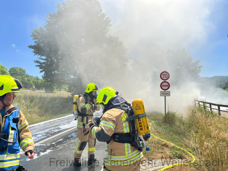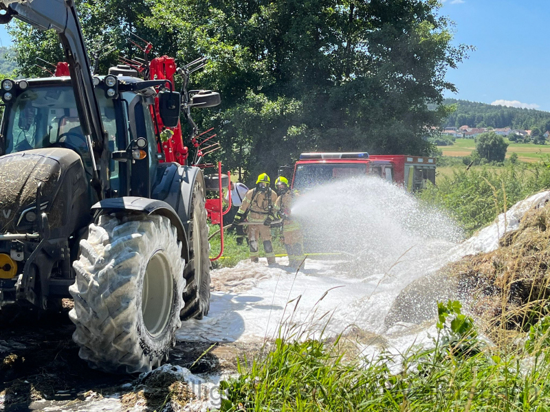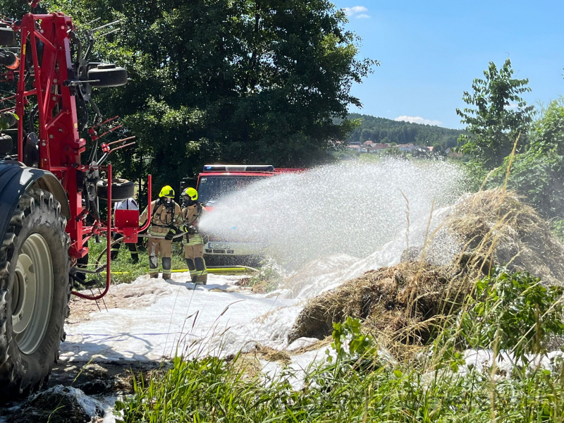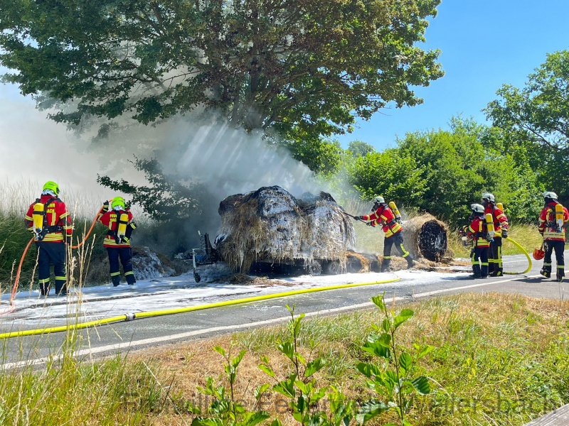 Am 25.06.2023 wurden wir unter dem Stichwort B3 zu einem Brand von acht Heuballen auf einem Anhänger auf der Verbindungsstraße ST2260 von Pretzfeld nach Wannbach alarmiert. Die Feuerwehr Pretzfeld leitete die Brandbekämpfung unter Atemschutz ein und wir unterstützten sofort mit zwei Atemschutztrupps. Ein weiterer Trupp löschte unter Atemschutz das brennende Heu ab, welches mittels eines Traktors auf die andere Straßenseite gebracht wurde. Drei weitere Atemschutztrupps befanden sich in Bereitschaft am Sammelpunkt. Da wir unser LF 20 mit Wasser speisen mussten, richteten wir einen Pendelverkehr mit unserem LF 8 ein. Unser MTW konnte bei der Absicherung der Einsatzstelle und Sperrung der Straße unterstützen. Gemeinsam mit den Feuerwehren aus Pretzfeld, Kirchehrenbach, Wannbach und Lützelsdorf konnte der Brand rasch unter Kontrolle gebracht  und gelöscht werden. Der Einsatz war für unsere Feuerwehr gegen 13.20 Uhr beendet.